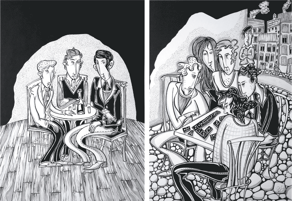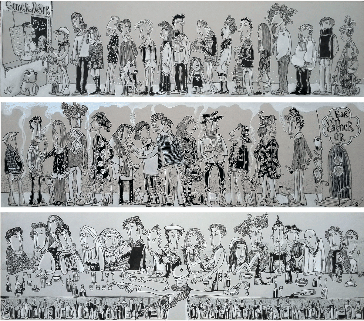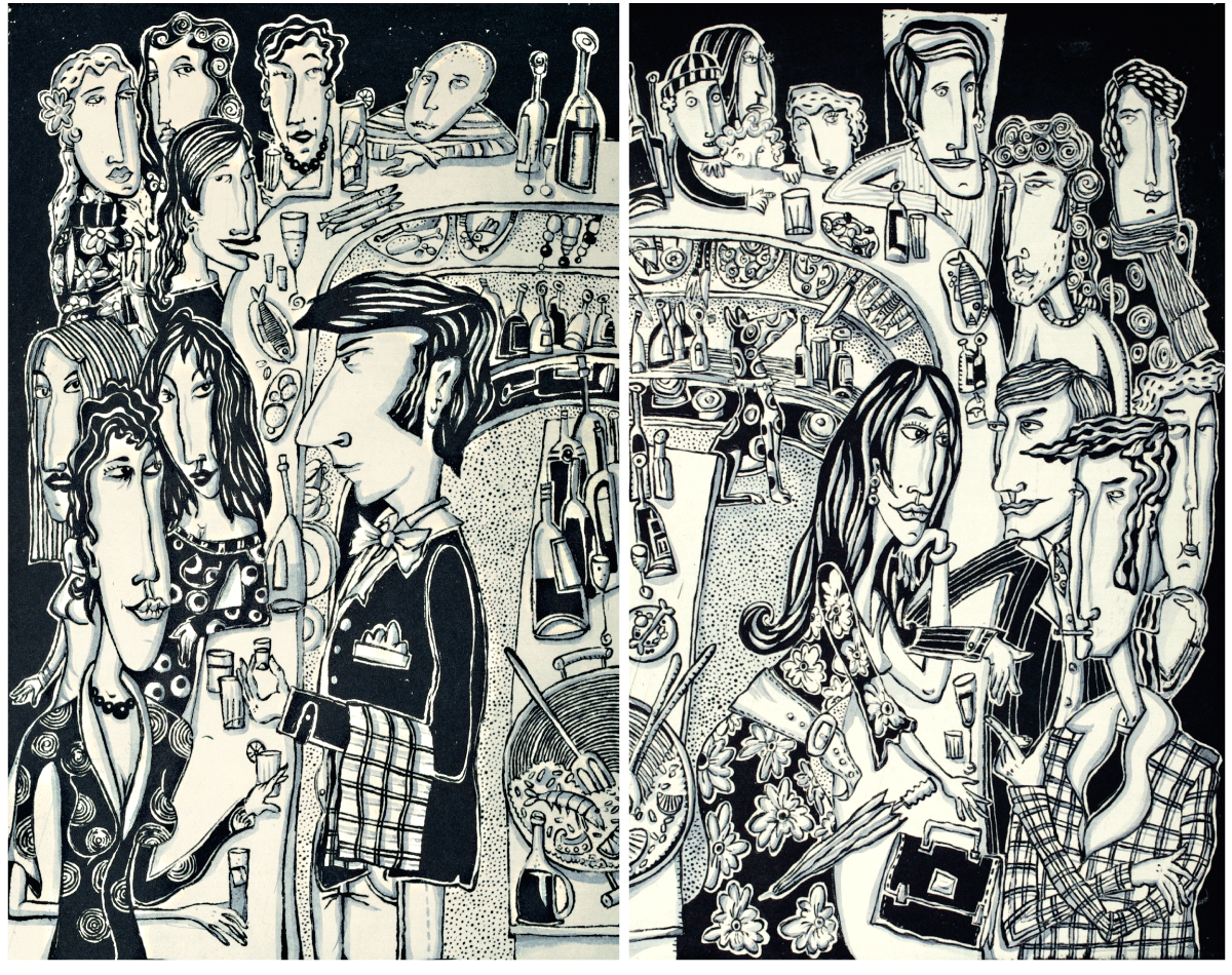 Schwarz-Weiß Illustrationen und Wimmelbilder in verschiedenen Techniken: Tusche, Radierung (Aguatinta) und Linolschnitt